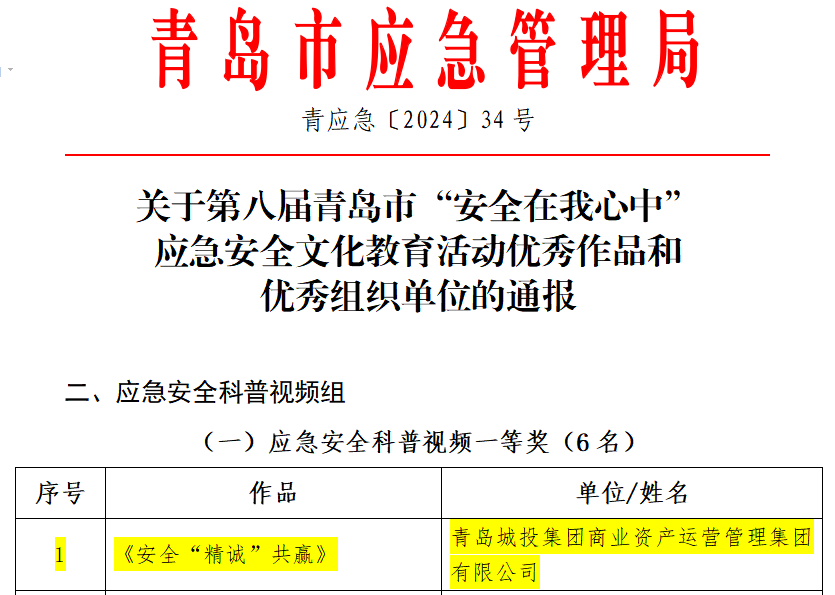 商管集团荣获第八届青岛市“安全在我心中”应急安全文化教育活动中荣获应急安全科普视频一等奖。