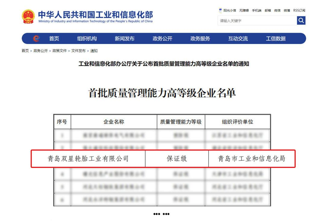 行业唯一!双星轮胎入选工信部质量管理能力高等级企业名单