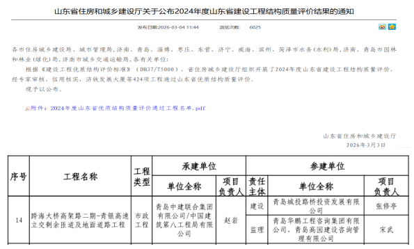 近日,山东省住房和城乡建设厅官网公示“山东省建设工程结构质量评价结果”,由青岛城投城市更新集团代建的跨海大桥高架路二期-青银高速立交剩余匝道及地面道路工程,顺利通过“山东省优质结构质量评价”认定。