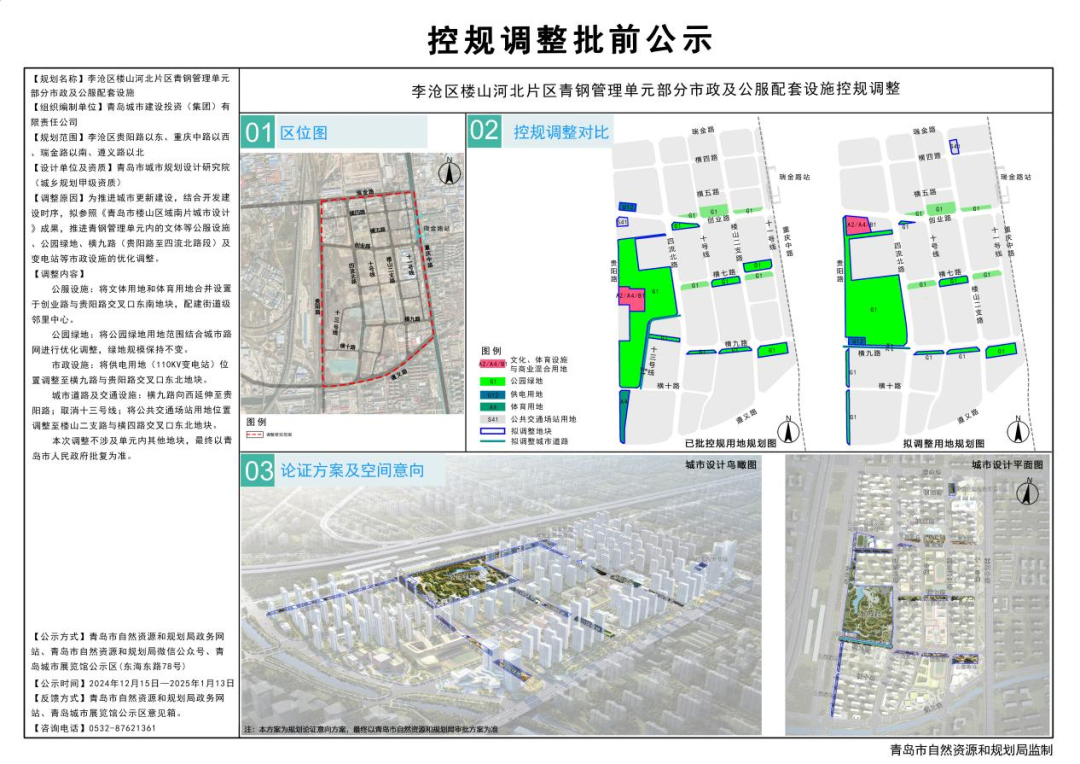近日,市自然资源和规划局组织创智菁英城(青钢片区)部分市政及公服配套设施控规调整批前公示,公示期2024年12月15日至2025年1月13日。